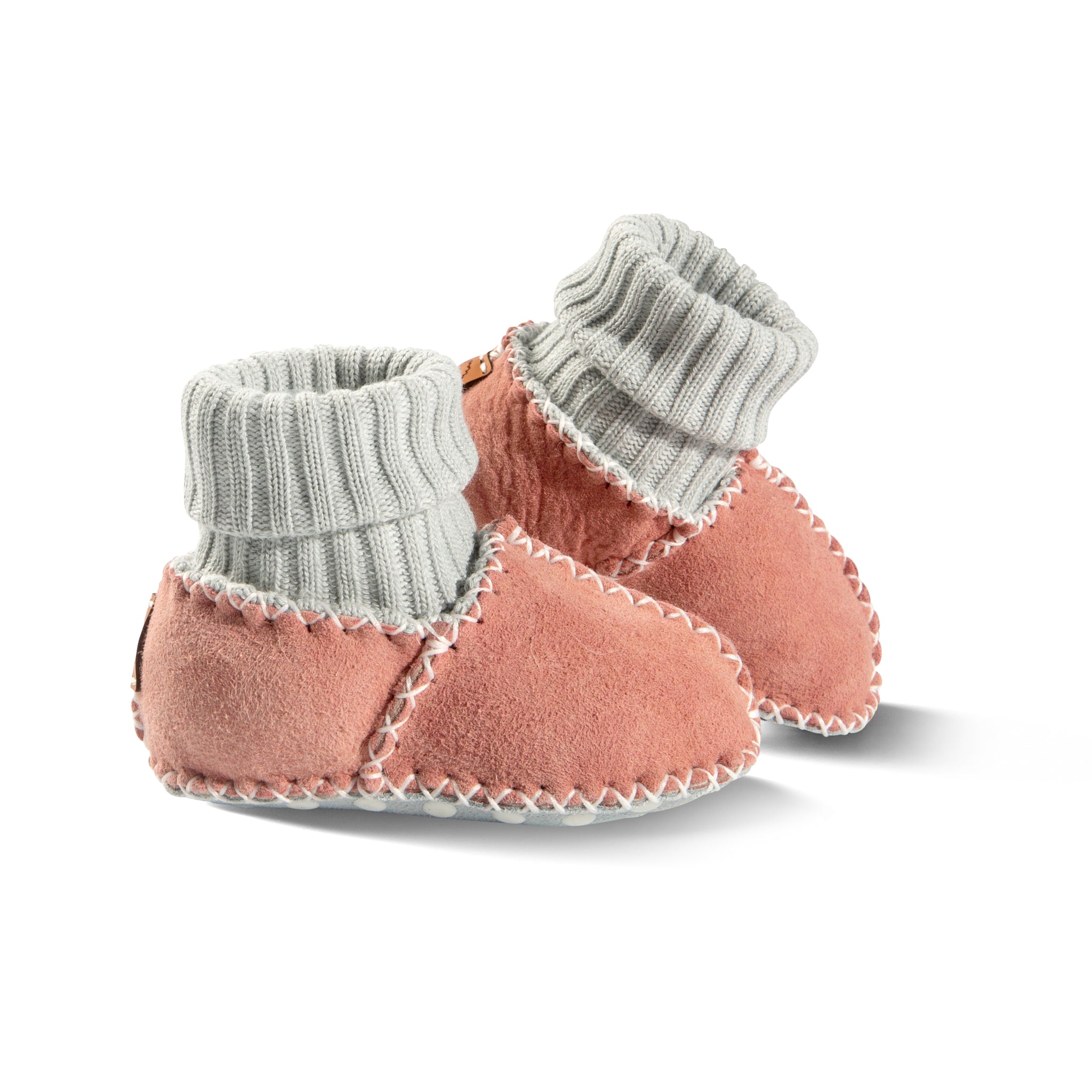 Der Krabbelschuh ist mit weichem Lammfell gefüttert und bietet durch den Strickbund perfekten Halt. Der Strickbund kann ausgerollt auch das ganze Bein wärmen.