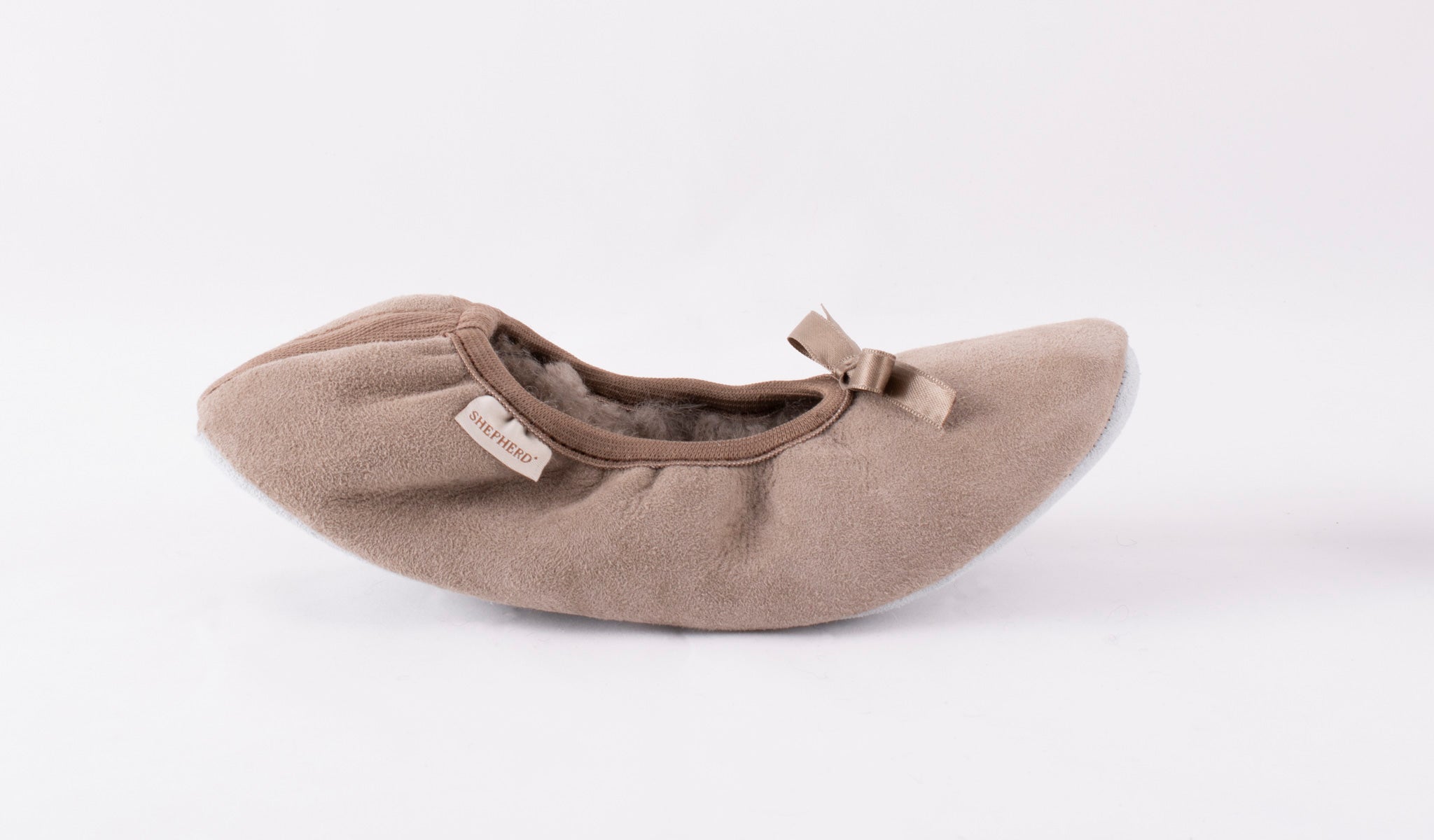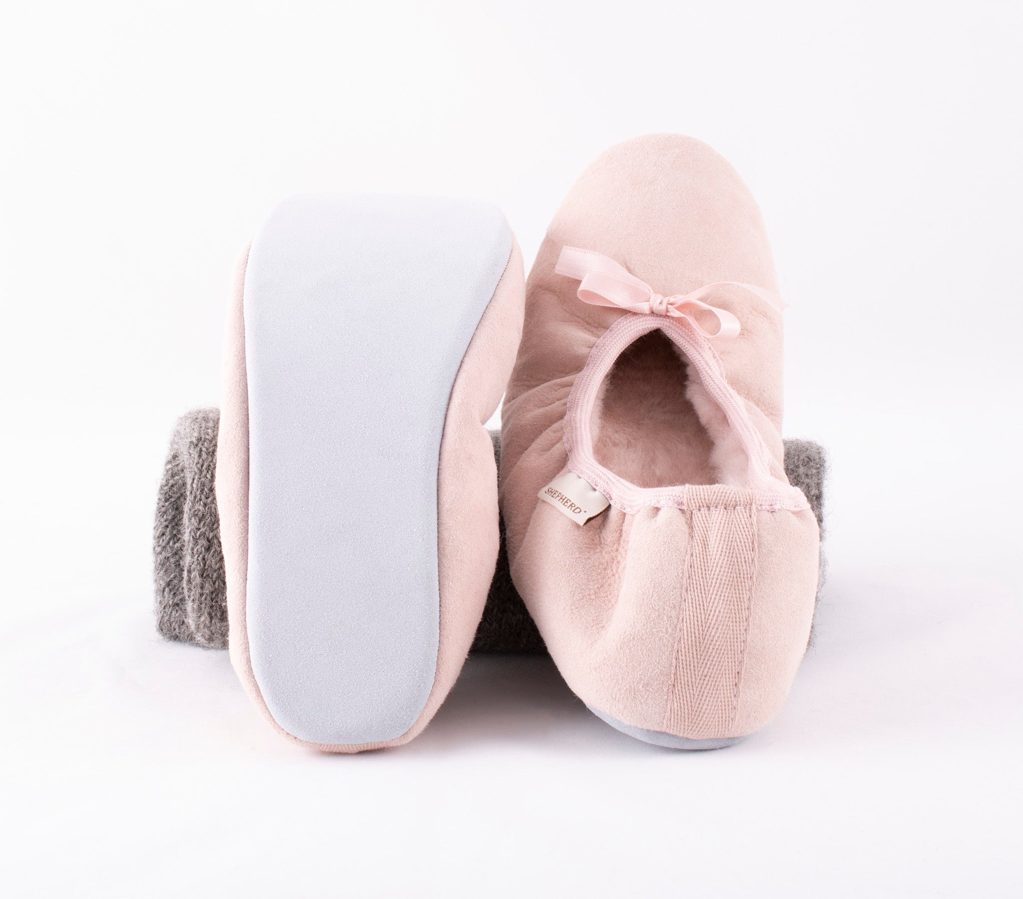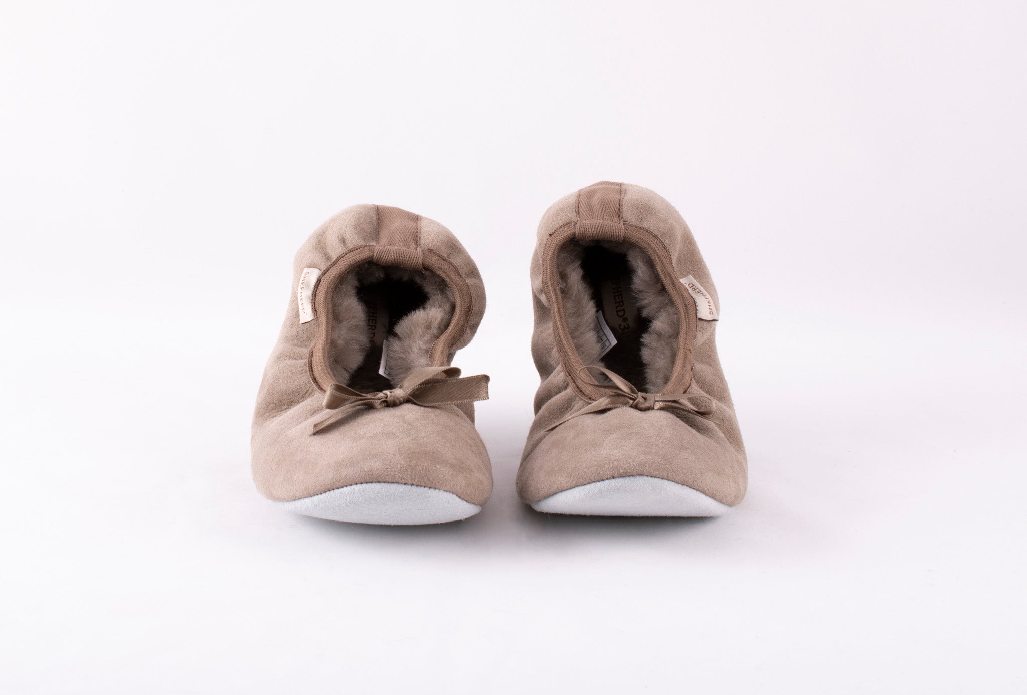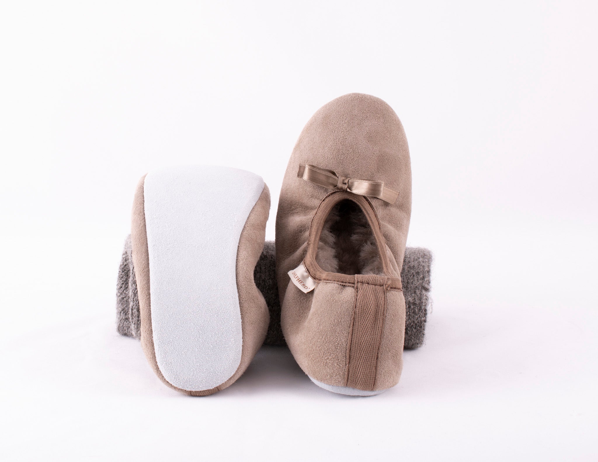 Sehr feminin. Hübsche Ballerina aus hochwertigem Lammfell. Schöne Verarbeitung mit angenehmen Gummizug und hübscher Schleife.